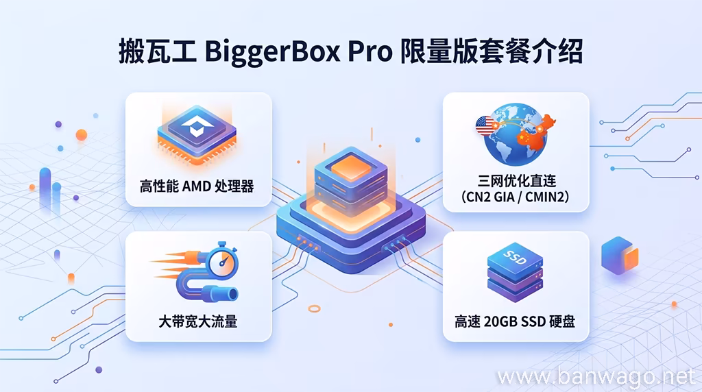 搬瓦工(BandwagonHost)作为广受欢迎的 VPS 提供商,近期推出了一款限量版套餐 BiggerBox-Pro。这款套餐专为对网络质量有较高要求的用户设计,采用了全新的美国洛杉矶 DC1 机房,并承诺为中国电信、联通、移动三网用户提供 CN2 GIA 和 CMIN2 级别的优化直连线路。如果您正在寻找一款性能稳定、网络出色的美西VPS,那么本站的这篇文章将为您提供全面的详细介绍。